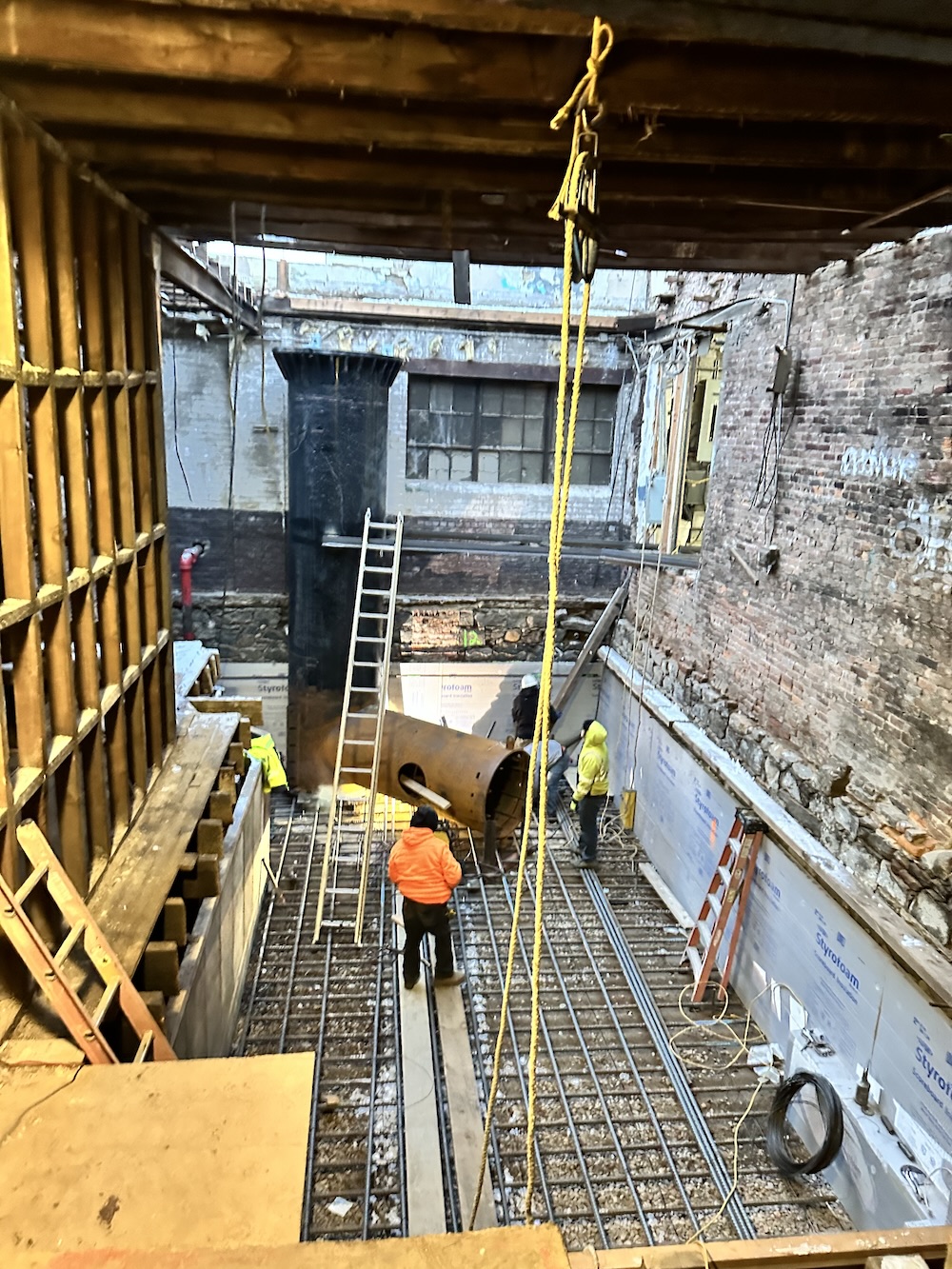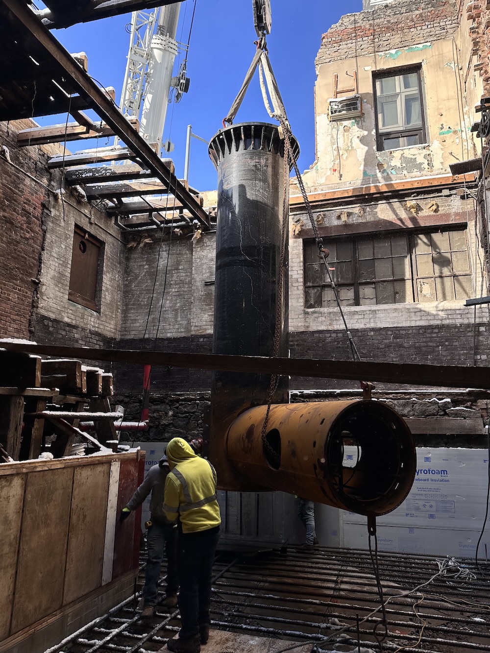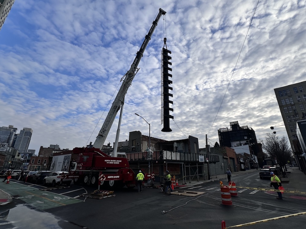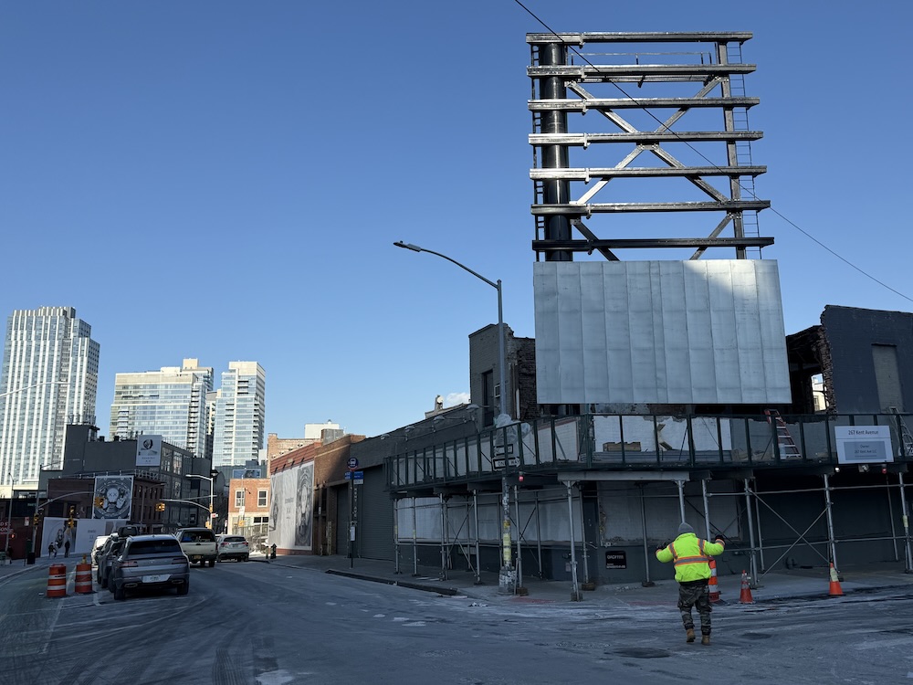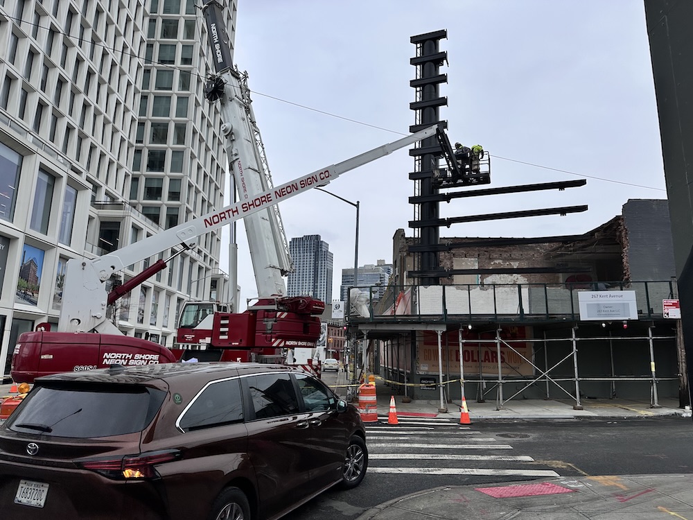 NSN erected the sign structure, metal backing panels & vinyl sign face for a new 42′ high x 25′ wide billboard at the corner of Kent Ave & S 1st St in Williamsburg. Unique challenges on this project included provisions for temporary bracing for the “dogleg” steel pipe assembly that was installed first on a concrete setting pad & braced to the adjacent building concrete floor slab to stabilize it while concrete was poured and set around the pipe. NSN considered the eventual deflection of the signage cantilever when setting this pipe, which was set just out level so the deflection would pull the sign back into level when fully loaded. Our work included the complete roadway closures of Kent Ave & S 1st St in order to place our 95 ton crane needed to lift the largest piece, the main upright monopole, at ~48′ long and 32,000 lbs.
